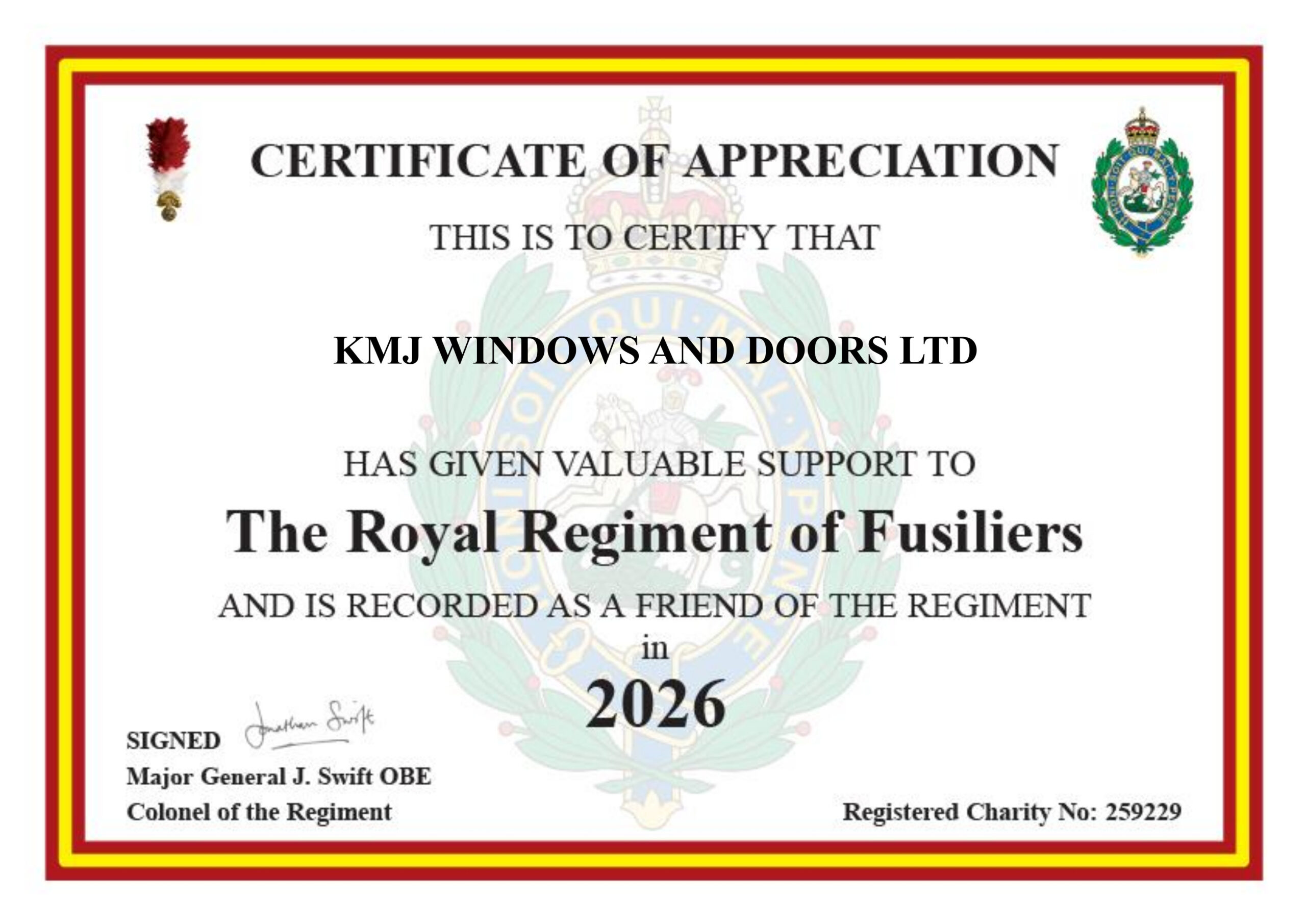 At KMJ Windows and Doors Ltd, we are delighted to support The Royal Regiment of Fusiliers Aid Society (Registered Charity No. 259229) in 2026 as our chosen charity.